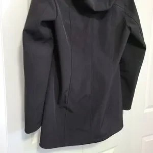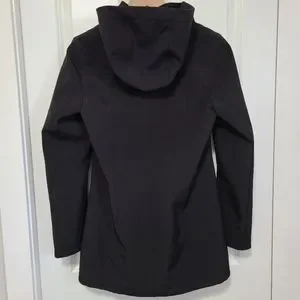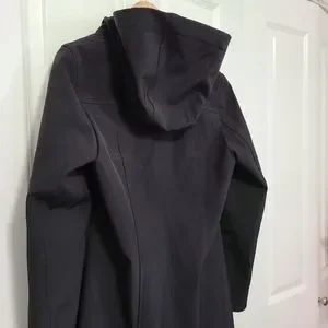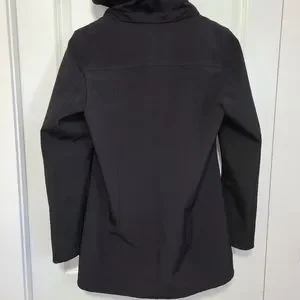 Black soft shell jacket. Long, streamlined flattering fit.