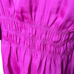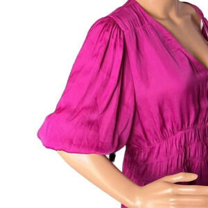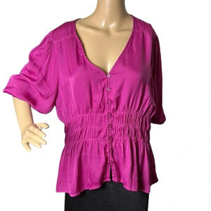 ANDREW MARC balloon sleeve blouse,smocked,deep V,button accent,satin like,barbie