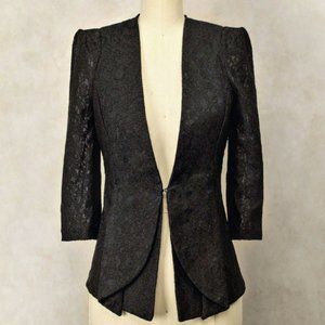 Beat the heat this summer with this gorgeous lace blazer by Angel Eye London. High-low hem, tuxedo front with hook and eye clasp, sheer back and 3/4 sleeves. Perfect day to night look.
