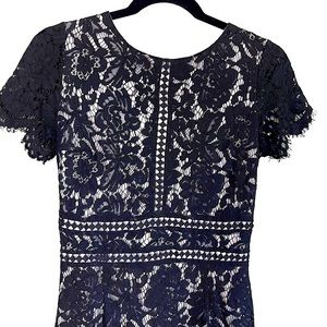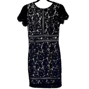 This is a beautiful black lace fitted dress with a white lining. The back has a zipper closure, and a tie up detail at the top of back.