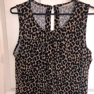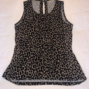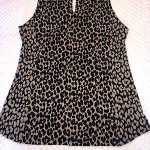 Classic animal print sleeveless top with scoop neck, curved hemline and keyhole opening with button closure at back neckline. Can be worn tucked in or left out. Perfect under a blazer at the office or fun with jeans/black slacks at a party! Relaxed fit. Stretch fabric and washable. Excellent condition! Size M