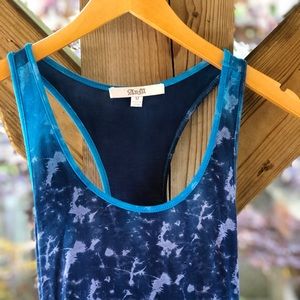 Beautiful summer blues, soft and stretchy, so comfortable! Shoulder to hem 152cm. Right side has gathering at waist/hip and a 58cm slit. Feels like wearing a comfortable t-shirt. Gently worn, in good condition.