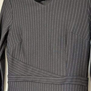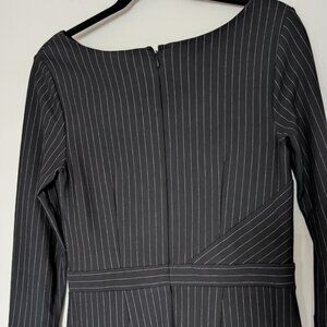 A black long-sleeved dress with white stripes from Ann Taylor. It has a zipper on the back and a faux belt/wrap design around the waist. The length drapes to around/below the knees. Size 4.
