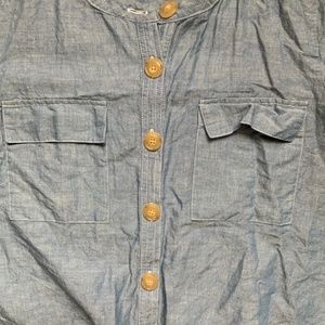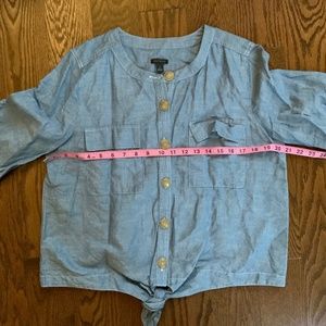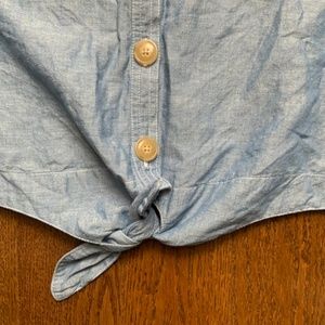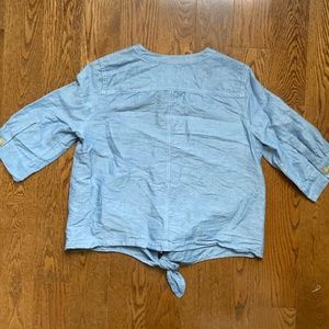 Very comfortable top with tie-up on bottom. Cotton linen blend. Light blue chambray.