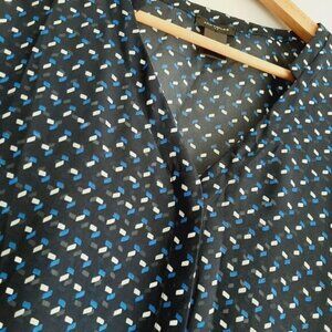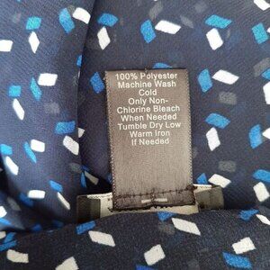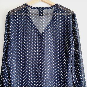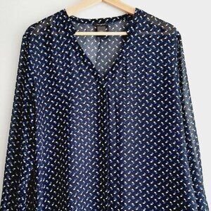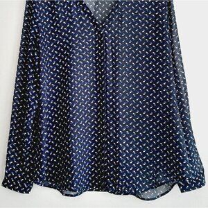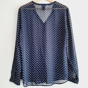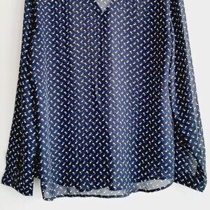 • Long sleeve vee neck semi sheer hidden button down closure blouse in navy with blue and white all-over abstract pattern.
