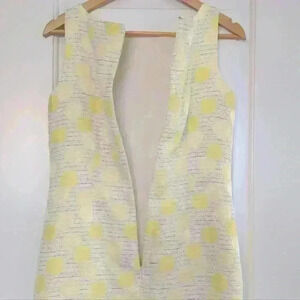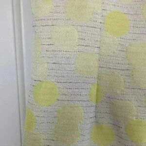 • Style: Sleeveless, back half zipper with hook and loop, tweeded material w/ metallics woven through, yellow polka dots, fully lined, midi