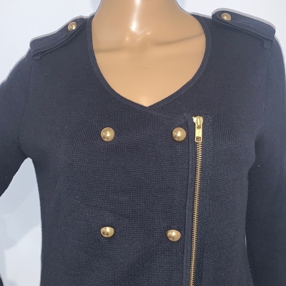 Ann Taylor Military Inspired Navy Blue Merino Wool Zip up double breasted Cardigan size Medium