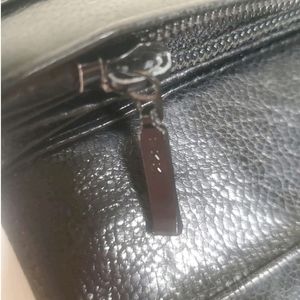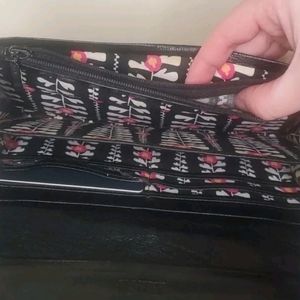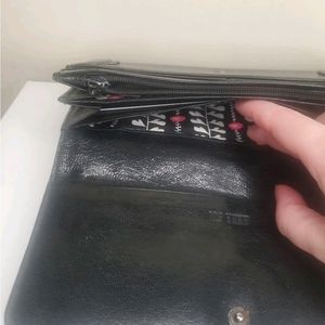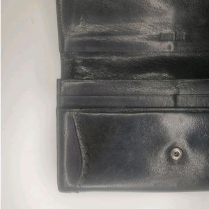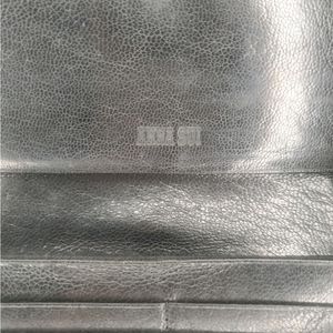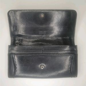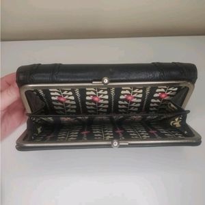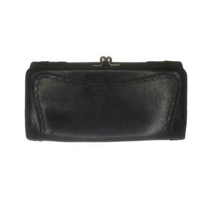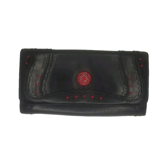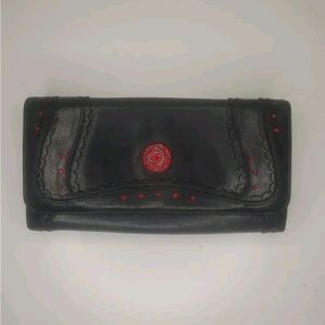 This medium-sized clutch wallet has a folding design, making it easy to carry around. The interior is lined with a multicolor fabric, adding a touch of elegance to the wallet. The hardware color is red, which adds a pop of color to the black exterior. This vintage piece is a part of Anna Sui's product line and was manufactured in Japan. The wallet has a single leather handle/strap material, making it easy to hold.