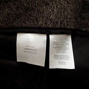 Elegant Anne Klein mid-rise trouser with flat waist and straight fit. The colour is a warm tone brown and cream wool blend, fabric has a beautiful twill look. 2 front-facing pockets and 2 decorative (non-functional) pockets at the back. Hidden zip, hook and button closure for a seamless flat front. Very elegant office look, or formal party look. These would also work very well in a collegiate, preppy, or dark academia look. I wore these trousers to a job interview at a fashion boutique and not only did I get the job, I got complimented on my outfit :)
