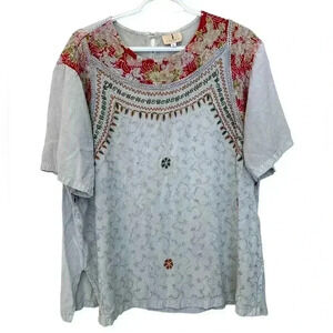 Beat the heat with this 100% cotton tunic! This is in excellent used condition, has attractive embroidery and trim, and can be washed at home. Made of a nice soft cotton.