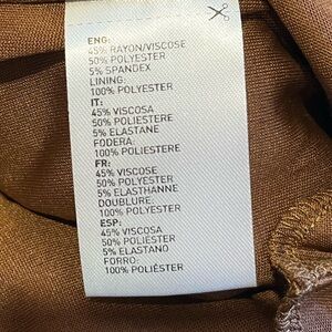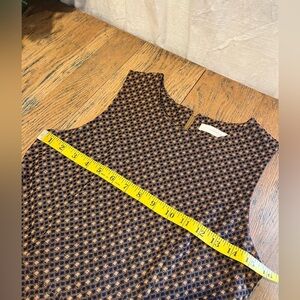 Chic sleeveless dress with a geometric navy and camel pattern. Made from a soft blend of viscose, polyester, and a little spandex for comfort. Lined. Side pockets. Hidden back zipper. Elegant and timeless!
