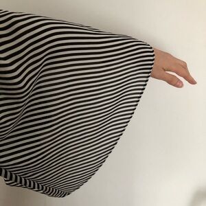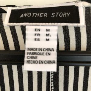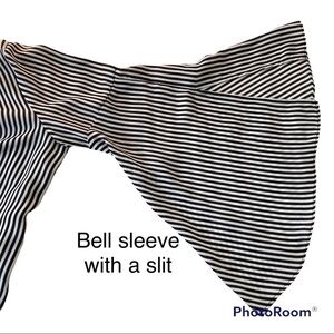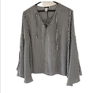 Another Story Boho Pretty bell sleeve fluted sleeve vertical black & white striped blouse. Another story top with front lace up neckline. Excellent condition with Small one thread run flaw as shown on photo. Slimming Vertical stripes.