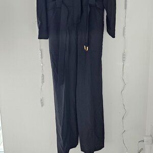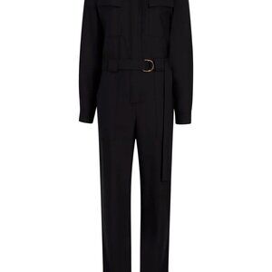 This black high-neck jumpsuit is made in Italy from 100% RWS merino wool. It features long sleeves, a belted waist, and a straight leg.