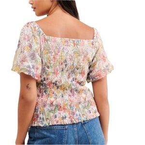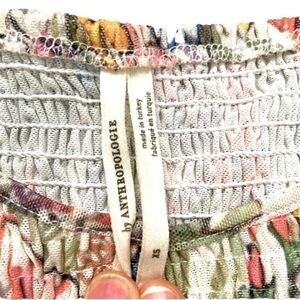 Beautiful trendy piece from Anthropologie in a size XS. Fully smocked bodice, cropped length at about 16” with a raw hem detail. Puff sleeves are 8” in length. Elastic at the bottom of the sleeve and the shoulder so they won’t slide down. Cream color background with bright floral pattern. Bust measures about 28” laid flat but lots of stretch due to the smocking