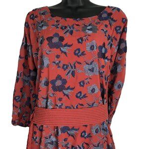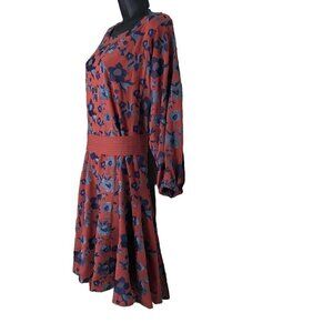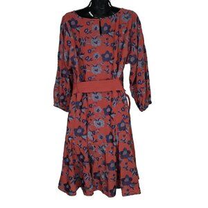 Anthropologie Bohemian Cognac Coloured With Blue Floral Embroidery With A Beautiful Belt And Ruffle Hem Size S