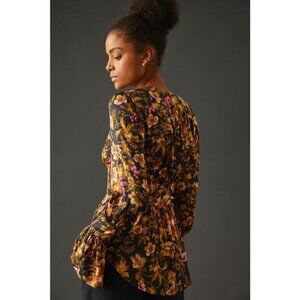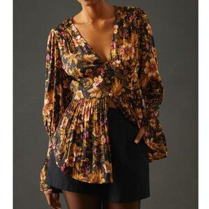 ANTHROPOLOGIE Deep-V Floral Bell Sleeve Button Up Tunic Sz Small