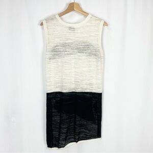 Unique sleeveless top by Anthropologie brand Left of Center. The fabric is a very light weight knit and is semi-sheer. The composition is 85% Cotton, 15% nylon. The cut is asymmetrical it opposite directions in the front and back. Size XS.