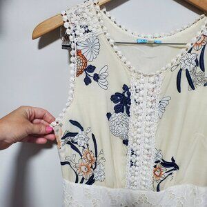 Color: cream / ivory, with white lace, orange, blue and white floral pattern, and a tan and black polka dot print pattern