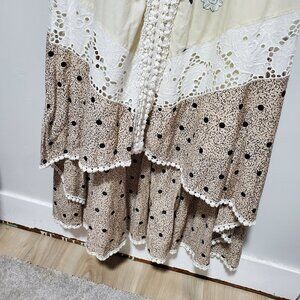Color: cream / ivory, with white lace, orange, blue and white floral pattern, and a tan and black polka dot print pattern