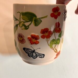 ANTHROPOLOGIE Letter H Embossed Sweetpea Flowers and Bee Ceramic Mug. Enjoy your favorite beverage in this charming floral initial mug. Featuring a cream base with vibrant multicolor designs, this mug adds a personal touch to your dining experience. Featuring garden-grown motifs with a personal finishing touch, this enchanting mug is sure to delight anyone with a green thumb and a passion for tea or coffee.