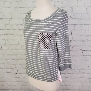 gray and white striped top, with a pink shirttail hem and printed front pocket,
