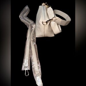 This companion zippered pouch paired with the Hollace Tote, but was not needed! In new condition, it comes with 1 shoulder strap and 1 crossbody strap. There is 1 compartment in this lightweight pouch, making it just right for travelling or walking! Polyurethane construction with gold-tone metal hardware and cream in colour