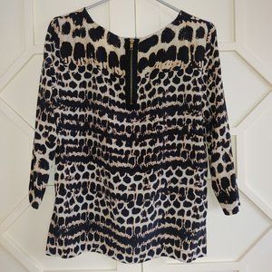 100% Silk, size small, in an abstract leopard print; boatneck fit with a slighter longer hem at back, and three quarter sleeves; great condition with only a slight pull in one of the sleeves (shown in photo) - not noticeable when worn. Elegant top over jeans or dress pants.