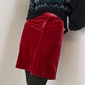 A gorgeous red velvet mini skirt. Perfect for the winter and holidays. Pairs nicely with a festive sweater, tights and boots.