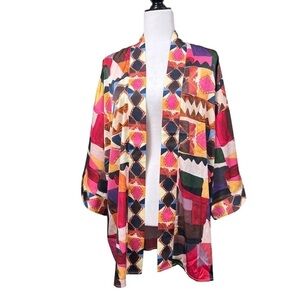 Excellent condition. No rips or stains. Lightweight. Perfect as summer cardigan / cover up. Polyester / Spandex, fabric has satin feel. Beautiful colorful cardigan. Fits size small to medium.