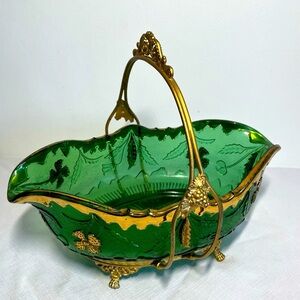 ANTIQUE Bride’s Basket Gilt Glass Bowl with Victorian Silver Plate stand.