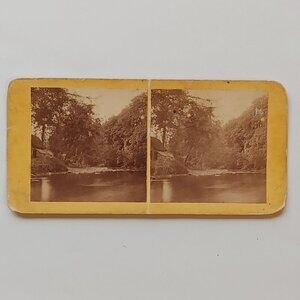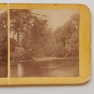 ANTIQUE STEREOGRAPH CARD Victorian Era Lakeside Scene Quaint Cottage