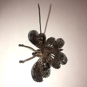 Gorgeous intricate antique silver filigree butterfly brooch, blue enamel spots.