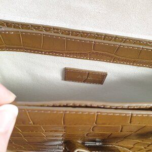 RRP 1030 CAD. 3 compartments. Golden brass finish, Adjustable shoulder strap, Worn on shoulder or crossbody. Top stitched edges, Card slot.