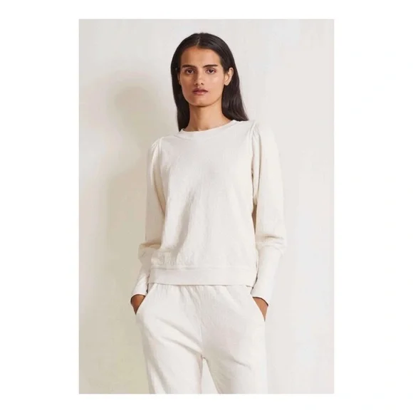 The Olimpio sweatshirt is a classic Apiece Apart silhouette. Everyone needs a good pullover for fall and this piece effortlessly dresses up or down. The balloon sleeves give you pop of fun while the rounded neckline and relaxed fit keep you comfortable.