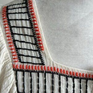This stunning APIECE APART Nueva Tewa Dress is crafted from 100% cotton and embroidered with a beautiful orange and black pattern along the neckline and hem. This dress is the perfect combination of modern minimalism and classic design, with its clean lines and southwest-inspired vibes.