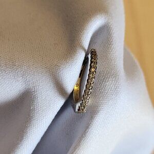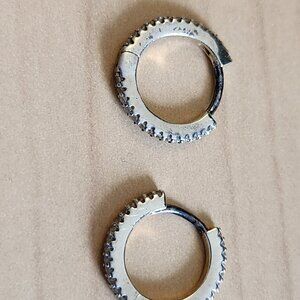 These earrings are crafted from sterling silver and feature small cubic zirconia stones set closely together to create a sparkling effect. The huggie hoop earrings are designed to sit close to the earlobe and can be worn alone or stacked with other earrings.