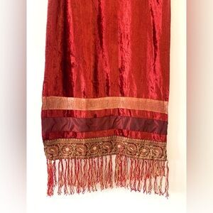 Rich red velvet with tapestry detail. Nice size, could be used as a scarf or a shawl.