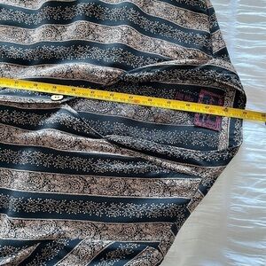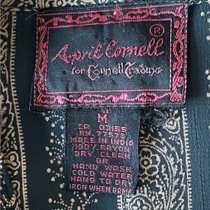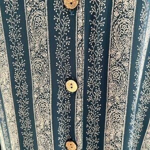 April Cornell for Cornell Trading long duster coat can be worn buttoned up (4 buttons), or open as a long duster coat. It has slits on both sides. Style it buttoned up with slim pants, flat ballet style shoes or sandals with a statement necklace, or wear it open with shorts and a tank top under it., or as a bathing suit coverup. 100% rayon, dark grey-blue with cream floral designs in a striped pattern.