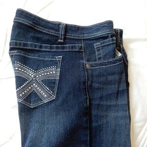 Apt. 9 medium rise denim jeans with boot cut with white stitching, diamond rhinestones on buttons and embellished back pockets.