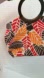 Aqua La Vie En Rose Beach Tote Bag with round brown wooden handles. Woven 100% paper with fabric lining. Interior open pocket. Snap closure. The pattern on the bag is leaves in brown, red and orange on a cream background.