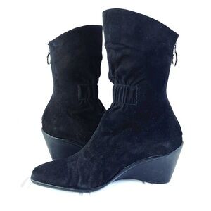 These Aquatalia black leather boots are the perfect addition to your winter wardrobe. Made in Italy, these ankle boots feature a platform sole and back zipper closure for easy on and off. The thick, durable leather will keep your feet warm and protected from the elements, while the stylish design adds a touch of sophistication to your outfit. Whether you're braving the cold to run errands or heading out for a night on the town, these boots will keep you looking and feeling your best.