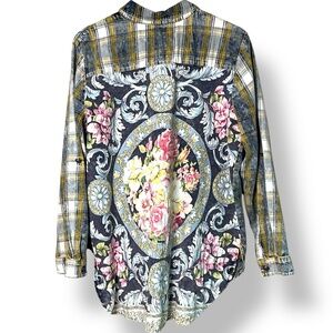 In very good pre owned condition. No size tag; I would put this as a large. Factory faded. Back is smooth cotton floral. Front and sleeves are lightweight flannel plaid. Enameled metal buttons (1 spare). Front patch chest pockets. Roll tab sleeves. Photos are important so please check all for condition, detail and measurements.