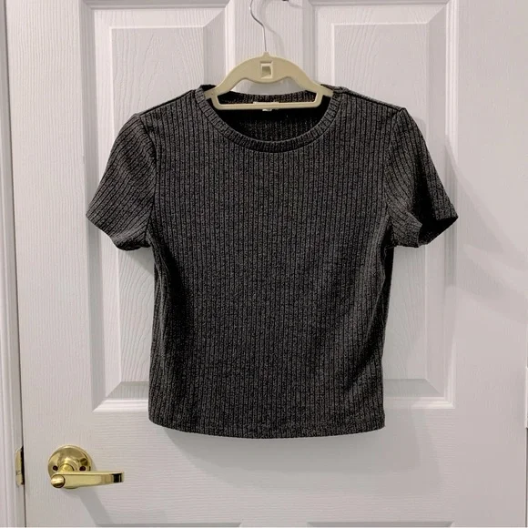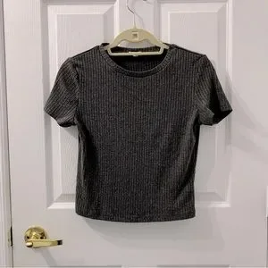 Gray t-shirt from Ardene. Shorter “baby tee” style coming down just a bit lower than the waist. Worn very lightly so in great condition, especially for an ardene piece!