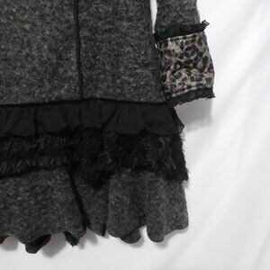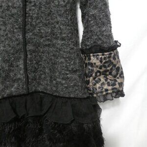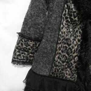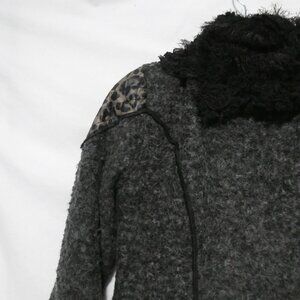 This stylish coat features a bold combination of textures, with a soft black faux fur collar and a mix of grey fabric and leopard print accents