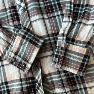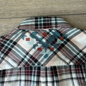 Southwestern vibe. Showcasing yarn dye plaid, this button-down shirt is accented with colorful embroidery at the shoulders and back, a left chest pocket, and a relaxed fit.