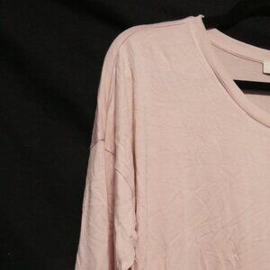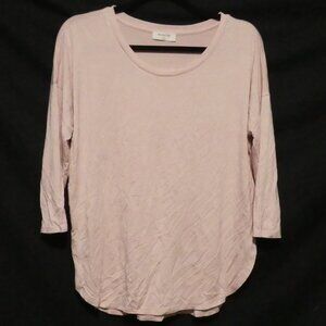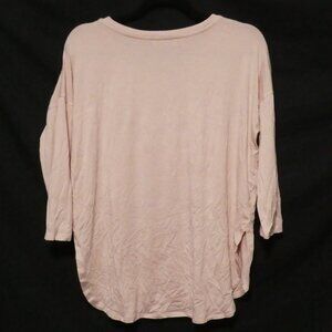 A comfortable light pink 3/4 sleeve shirt with a relaxed fit and slightly rounded hem