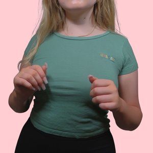 - cutest emerald/sea green crew neck t-shirt with "GOLDEN" embroidered in multi-colours in the front 🤍