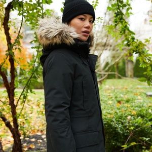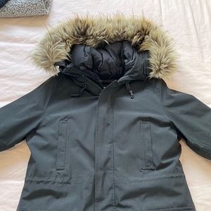 Stylish black parka. Features fur-trimmed hood. Perfect for cold weather. Very good condition.