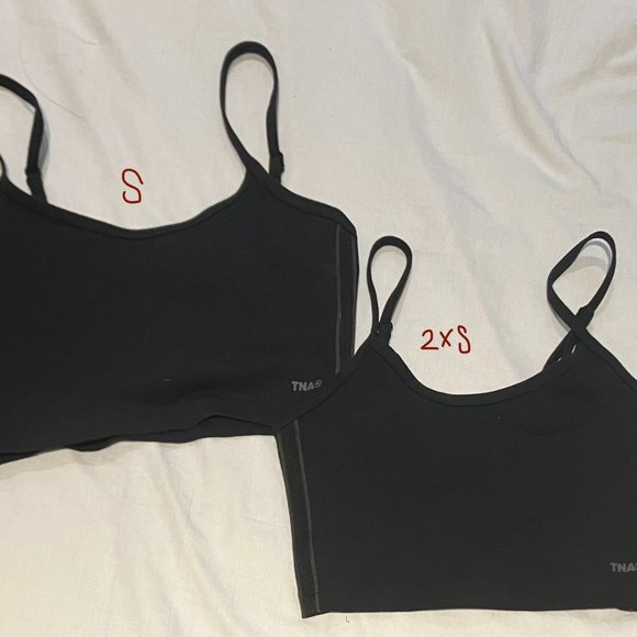 Two cropped tanks. Bought since I was unfamiliar with the sizing. 2XS is too small for me and S is too big. Only worn to try on the size. 2XS SIZING; Bust - 77cm Waist - 57 cm. S SIZING; Bust - 86-89 cm Waist - 66-69 cm. Last two pictures are from the aritzia website but I couldn't find one wearing black. There are stripes on both sides of the shirt so they are not 'plain' all the way around.