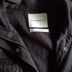 This is a Community- Aritzia jacket. Perfect for the fall or layered for those cooler days. In person the colour appears to be black but it can also be seen as a very dark brown. It was a very loved piece, worn often, but it sadly doesn't fit me anymore.